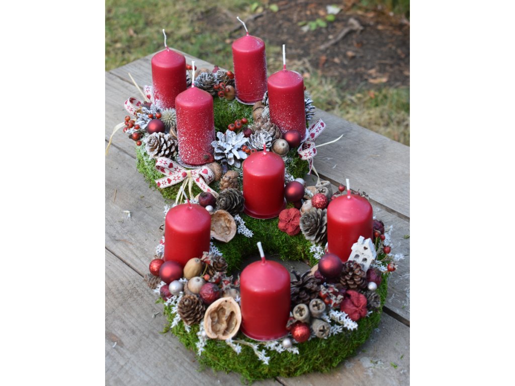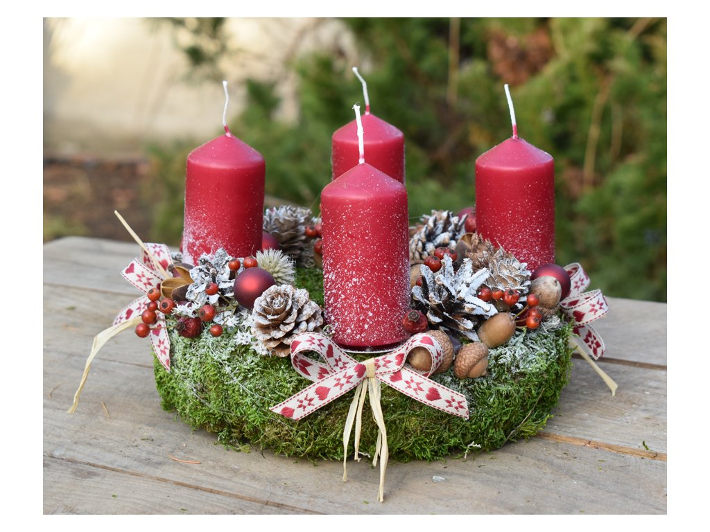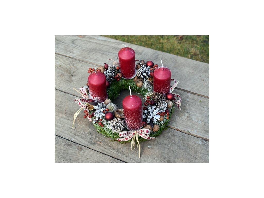 - Adventní věnec na mechovém základu. Vnější průměr věnce je 20 cm. Vhodný pro malé stoly.