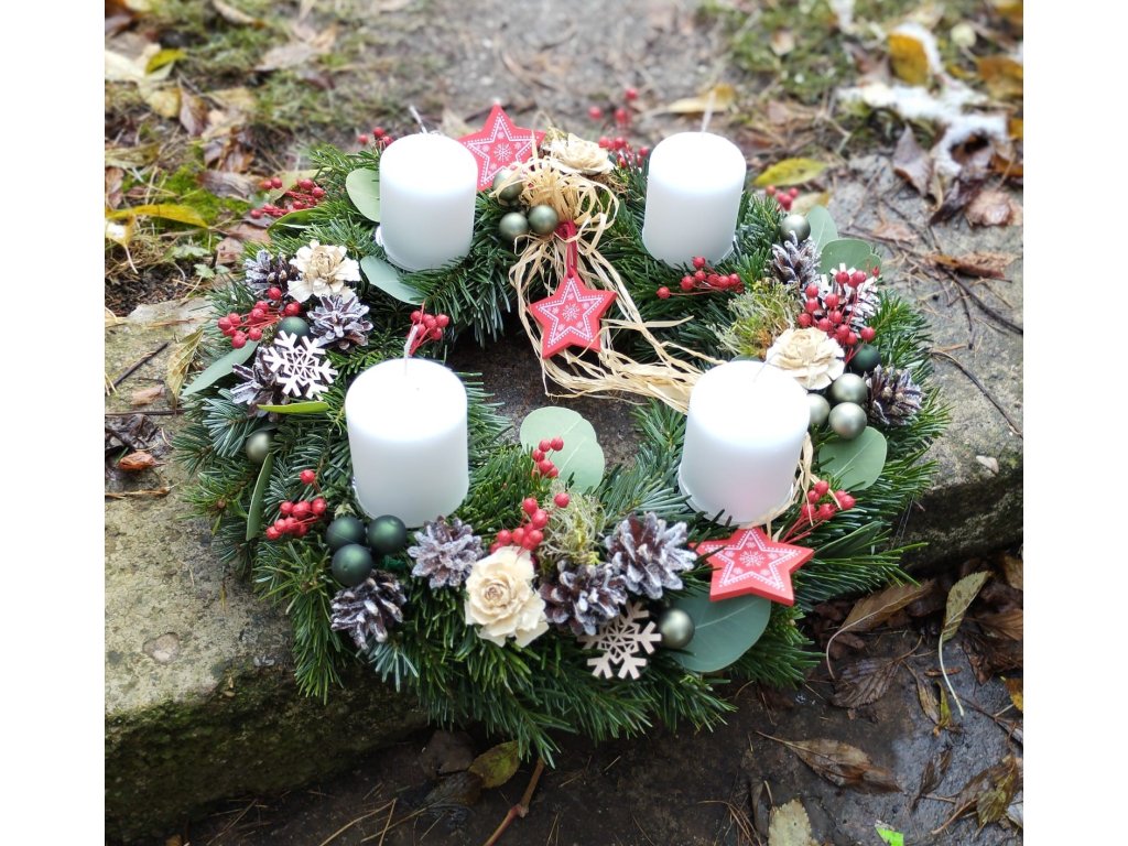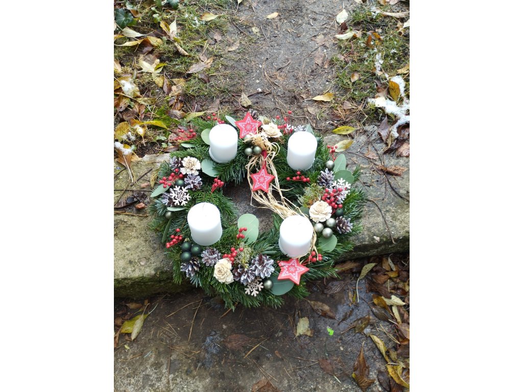 - Adventní věnec vytočený na slaměném kruhu o průměru 30 cm. Vnější průměr vytočeného věnce je cca 30-33cm.