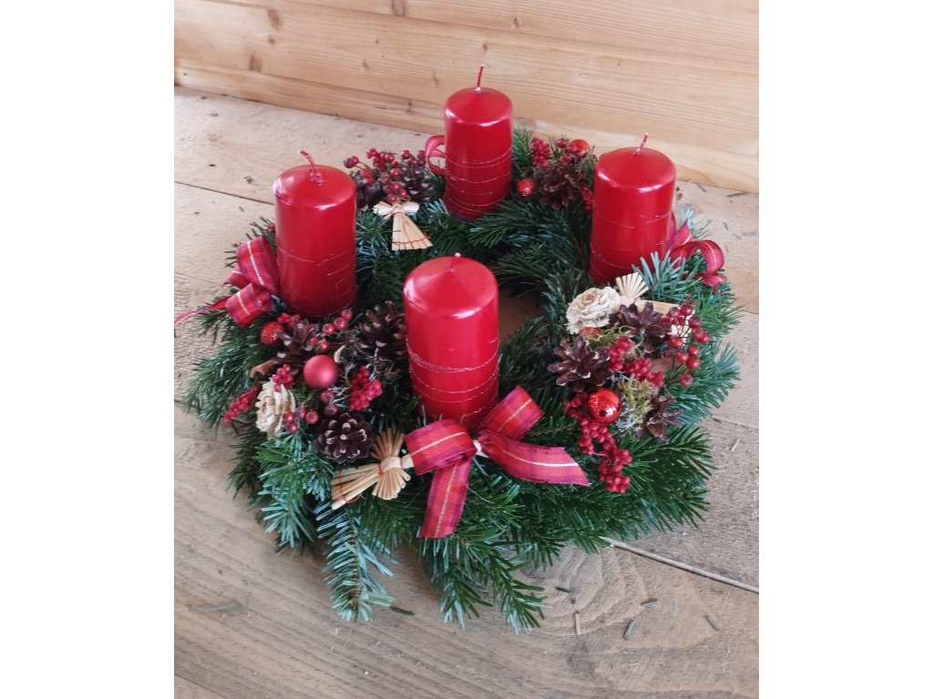 - Adventní věnec vytočený na slaměném kruhu o průměru 25 cm. Vnější průměr vytočeného věnce je cca 28 cm.