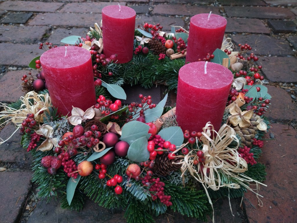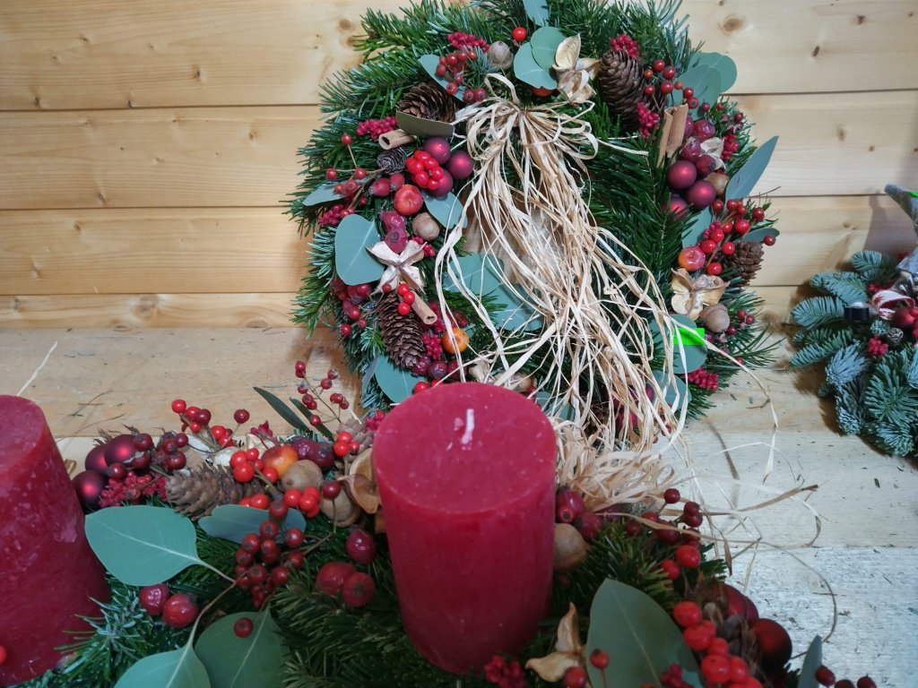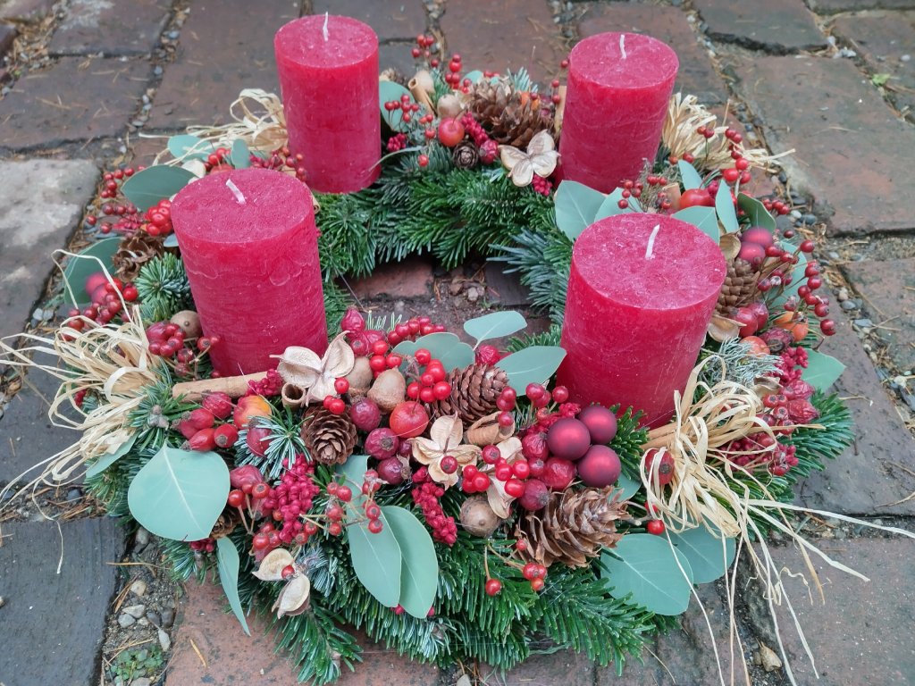 - adventní věnec LUXUSNÍ na velký stůl o průměru cca 40cm na jedlovém základu s přírodním zdobením.