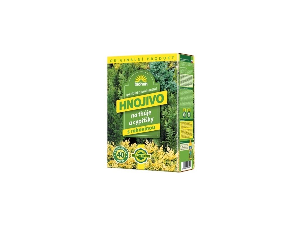 Biomin na thúje a cypřišky je vydatné, ekologicky příznivé organicko-minerální hnojivo, jehož významnou složkou je drcená rohovina. Tato přírodní surovina je zvláště ceněna pro obsah organicky vázaného dusíku, který se působením půdních mikroorganismů uvolňuje postupně, takže je rostlinami maximálně využit po delší vegetační obobí. V optimálním poměru jsou v tomto hnojivu zastoupeny i ostatní zdroje živin, nezbyté k harmonickému vývoji a růstu thújí a cypřišků.