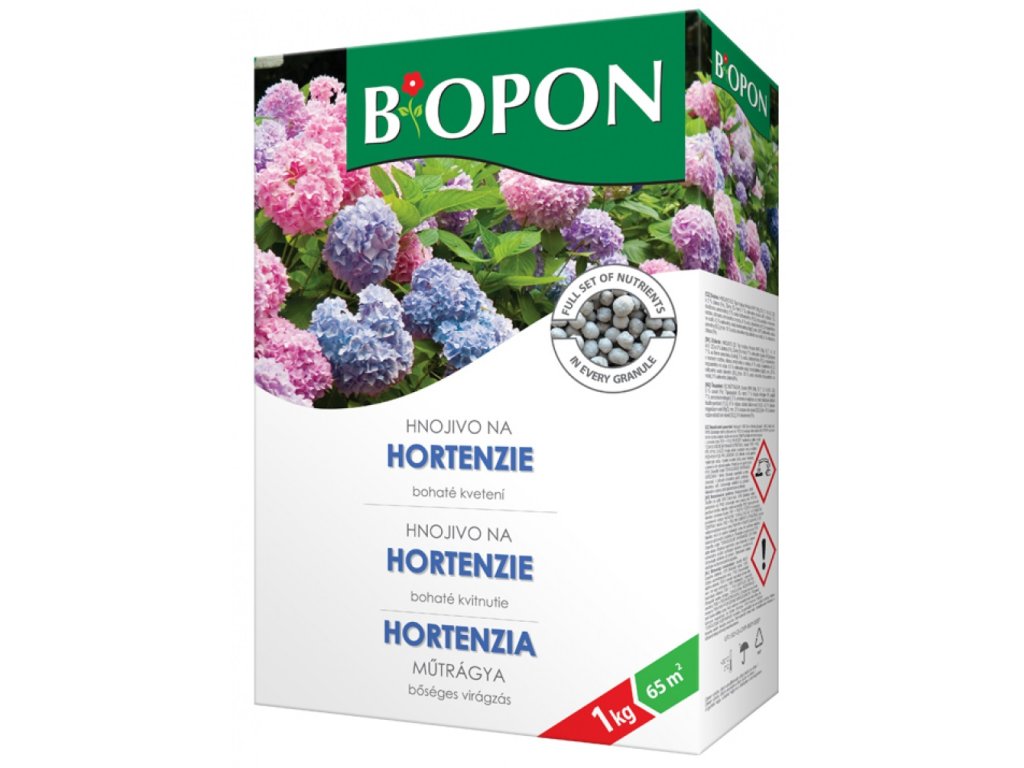 Vícesložkové minerální hnojivo určené k hnojení hortenzií. Obsah fosforu stimuluje vznik poupat a prodlužuje dobu kvetení. Obsah draslíku zvyšuje imunitu rostliny proti vymrzání. Vhodné složení mikro a makročástic je zárukou správného růstu a zdravého vzhledu rostliny.