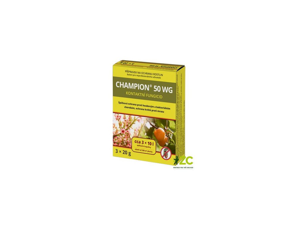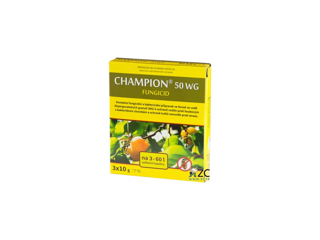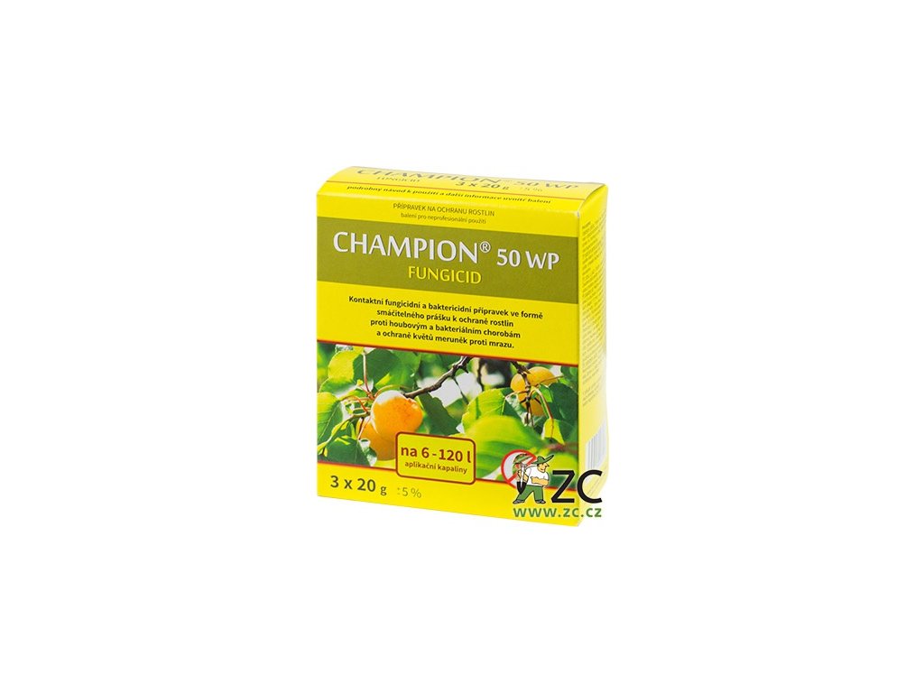 Champion 50 WP obsahuje hydroxid měďnatý, který je fungicid a baktericid s protektivní účinností a širokým spektrem účinku. Champion 50 WP se používá proti plísni bramborové, cibulové, okurkové a révové, proti černi rajčatové, septorióze rajčat a celeru, bakteriákní skvrnitosti okurek, kadeřavosti listů broskvoně, proti ochraně květů meruněk před mrazem, bakteriální spále jablóňovitých u jabloní a hrušení ( je možno použít i ve školách před olistněním ), bílé skvrnitosti listů jahodníku, rakovinné umírání větví u třešní a višní, proti hnědnutí listů ořešáků a puchrovitosti slivoně.
