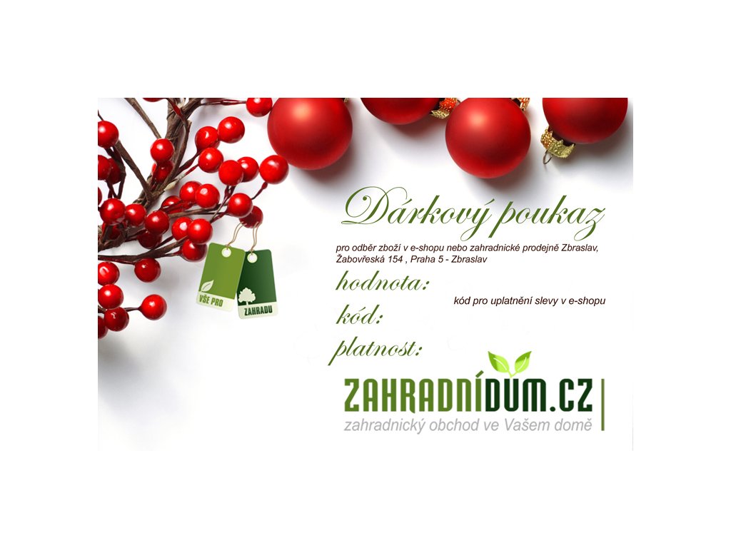 Dárkový poukaz je možné uplatnit v e-shopu www.zahradnidum.cz., nebo kamenné prodejně Zbraslav.