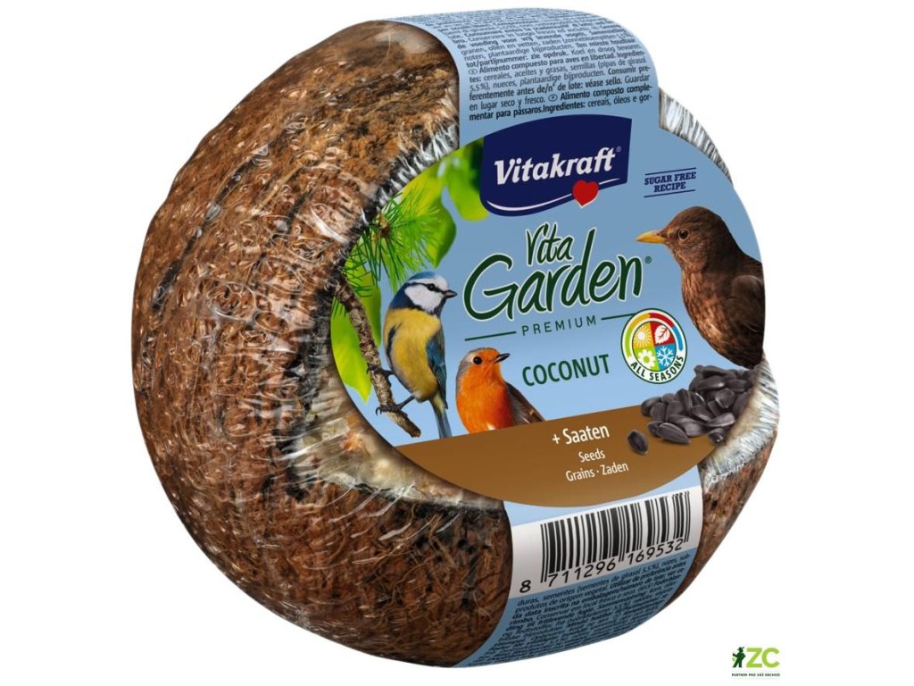 Doplňkové krmivo pro zahradní ptactvo. Kokosy VITA GARDEN® jsou bohaté na tuky, obiloviny a chutná semena. Cenný doplněk stravy volně žijících zahradních ptáků po celý rok. Receptura bez cukru. Neobsahuje umělá barviva ani konzervační látky.