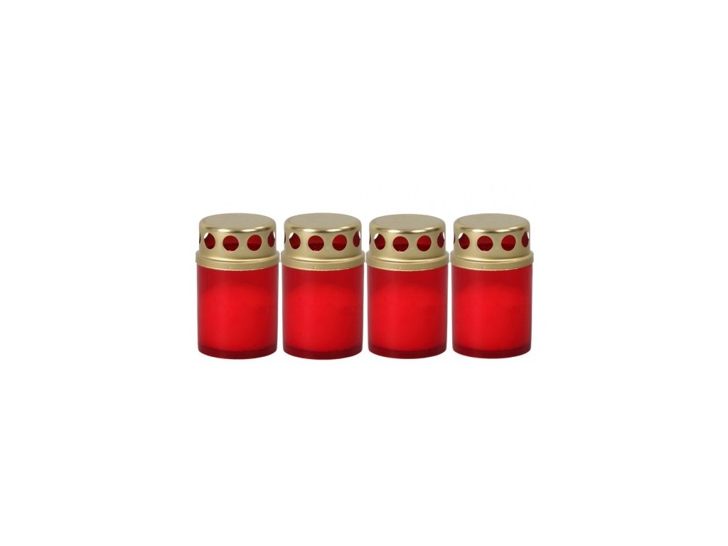 Červená plastová hřbitovní lampička s kovovým zlatým plochým víčkem. Hmotnost náplně: 40g. Velikost: d5 x 9 cm. V balení jsou 4 kusy.