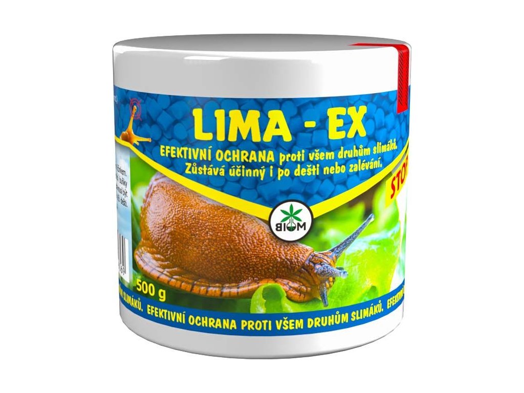 LIMA - EX je moluskocid ve formě granulované návnady k ochraně polních plodin, zeleniny, ovocných rostlin, trávníku a okrasných rostlin proti slimákům, plžům a hlemýžďům. Díky obsahu rostlinných atraktantů je pro ně vysoce atraktivní. Účinkuje dlouhodobě. Obsahuje zhořčovadlo, které zabrání psům a kočkám v konzumaci. Je vysoce odolný vůči dešti a vlhku.