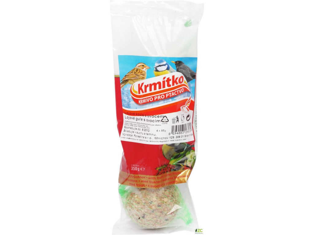 Lojová koule s ovocem Krmítko je vhodná pro venkovní ptactvo jako doplňkové krmivo. V letních měsících slouží jako příkrm, v zimě při nedostatku potravy jako důležitá část krmiva ptactva. Kouli je třeba umístit na místo chráněné před deštěm. Je v síťce, kterou je možné v případě umístění do krmítka sundat. Skládá se z ovesných a pšeničných vloček, obilí, ovoce a rostlinných olejů. V balení jsou 4 lojové koule po 90 gramech.