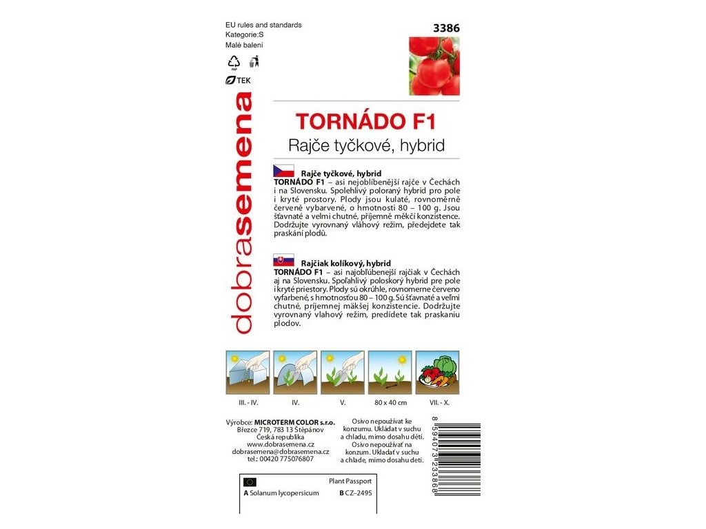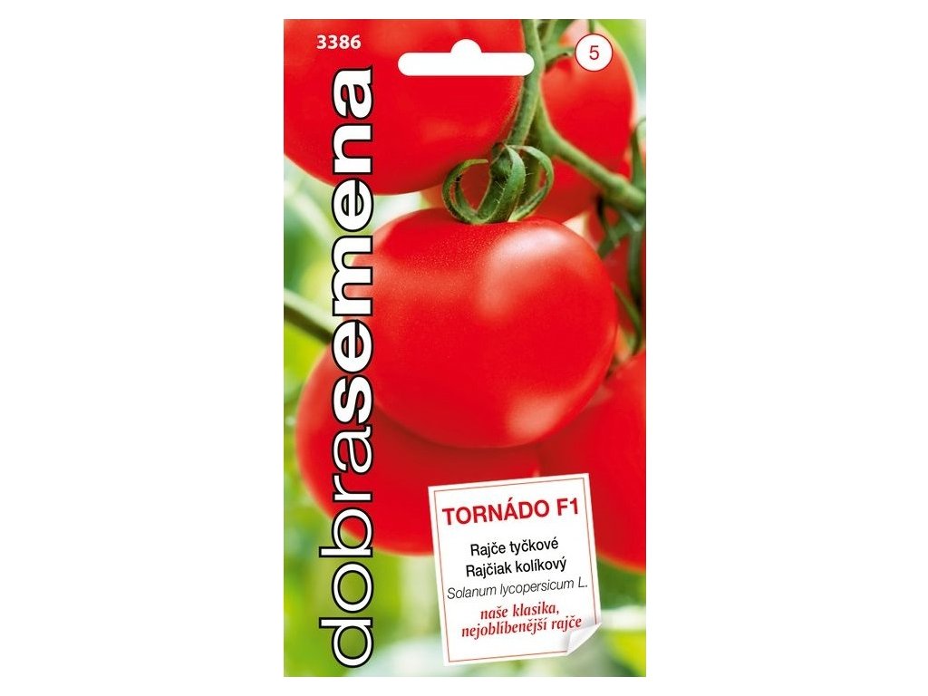 TORNÁDO F1 - stabilní výnos a plná, rajčatová chuť. Poloraný plastický hybrid s univerzálním použitím. Plody jsou kulovité až ploše kulovité, hladké, pevné. Dozrává do tmavočervené barvy. Vyžaduje vyrovnaný vláhový režim, aby se předešlo praskání plodů. Plody jsou kulaté, rovnoměrně červeně vybarvené, o hmotnosti 80-100 g.