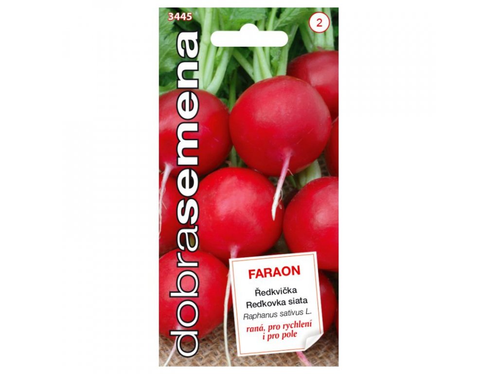 FARAON ¦ raná ředkvička k rychlení i k jarnímu a podzimnímu polnímu pěstování. Středně velké bulvičky jsou pravidelně kulovité, na povrchu intenzivně šarlatovo červené. Jsou odolné k praskání i k vybíhání do květu. Jedna z nejranějších ředkviček s vegetační dobou 28 ¦ 32 dní. Vyžaduje půdu dostatečně zásobenou živinami a pravidelnou závlahu.