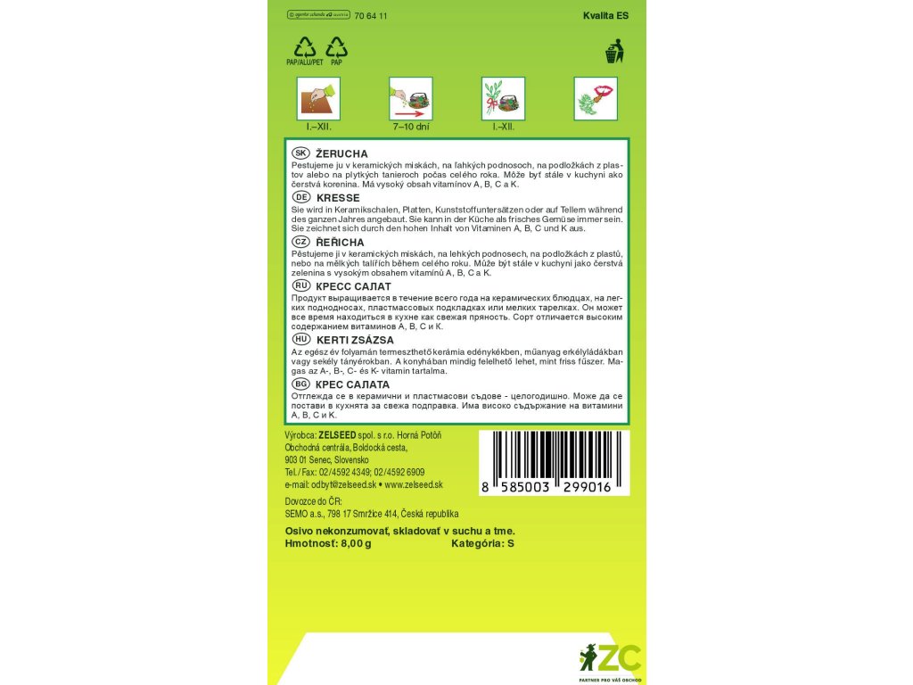 Jemná listová zelenina vhodná hlavně k rychlení v zimním a předjarním období. Sklízíme mladé rostlinky vysoké 4 – 6 cm. Vyséváme nahusto do truhlíků, misek či jiných pěstebních nádob. Sejeme na povrch substrátu a nezasypáváme. Výborným pěstebním substrátem je buničitá vata. Udržujeme přiměřenou vlhkost a teplotu 15 – 18oC. Nehnojíme. Sklízíme 7 – 14 dní od výsevu odřezáváním celých rostlin těsně nad povrchem substrátu. Z 1 m2 pěstební plochy získáme 0,3 – 0,4 kg zelené hmoty.