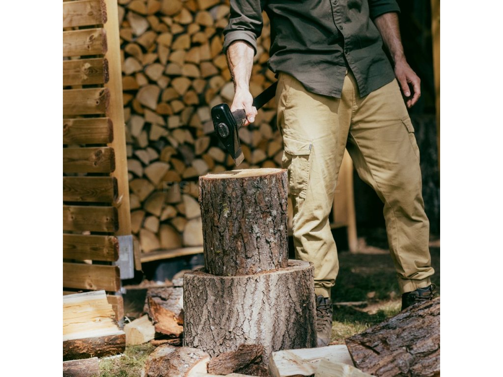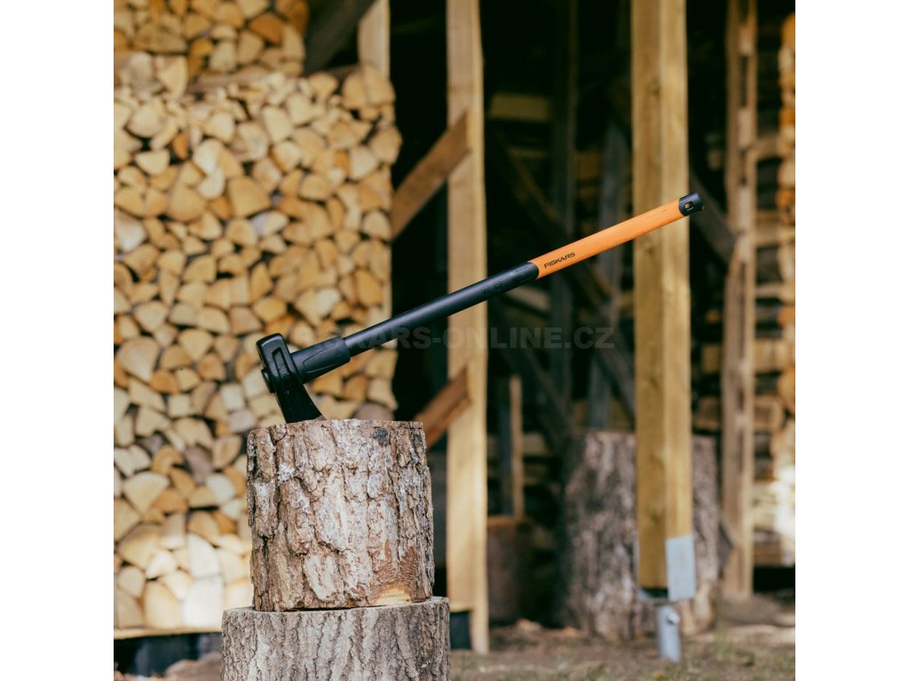 - Dřevorubecký kalač Fiskars 2500 se širokou čepelí je ideální na půlení špalků i osekávání větví.