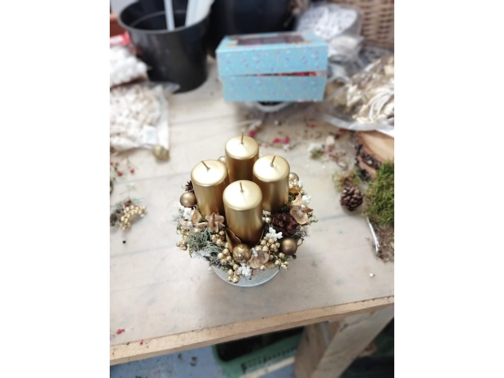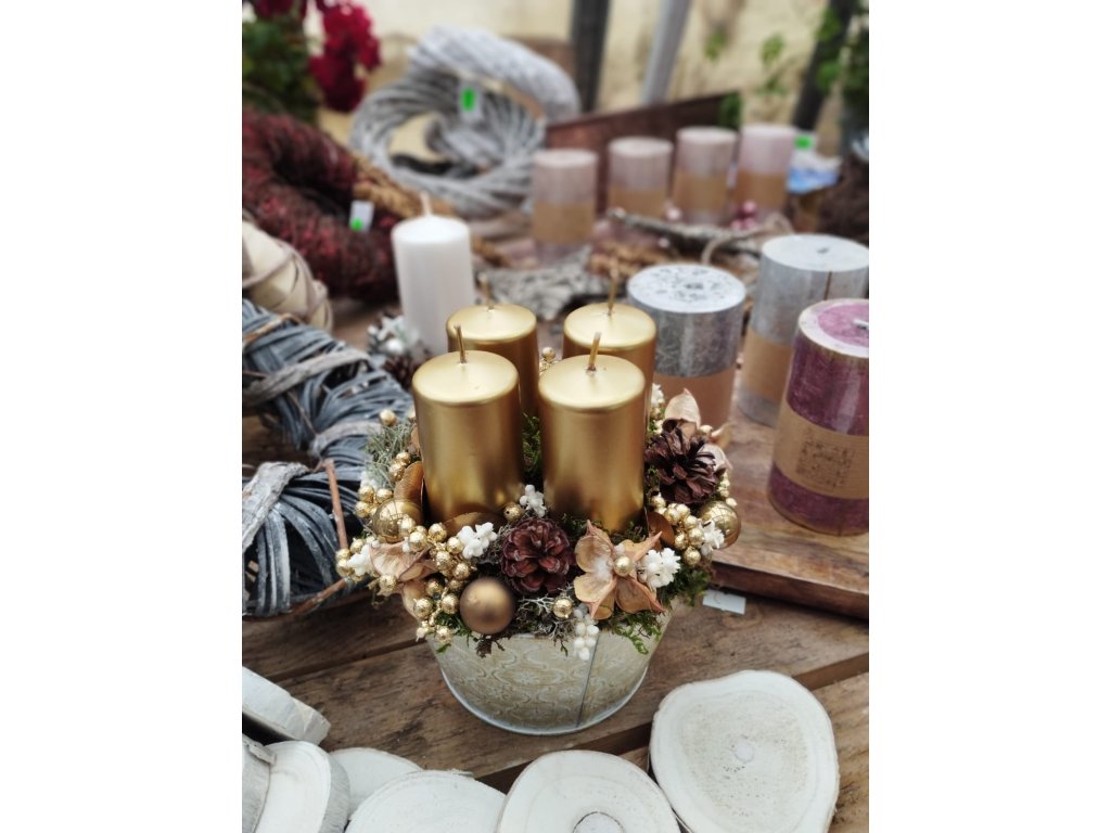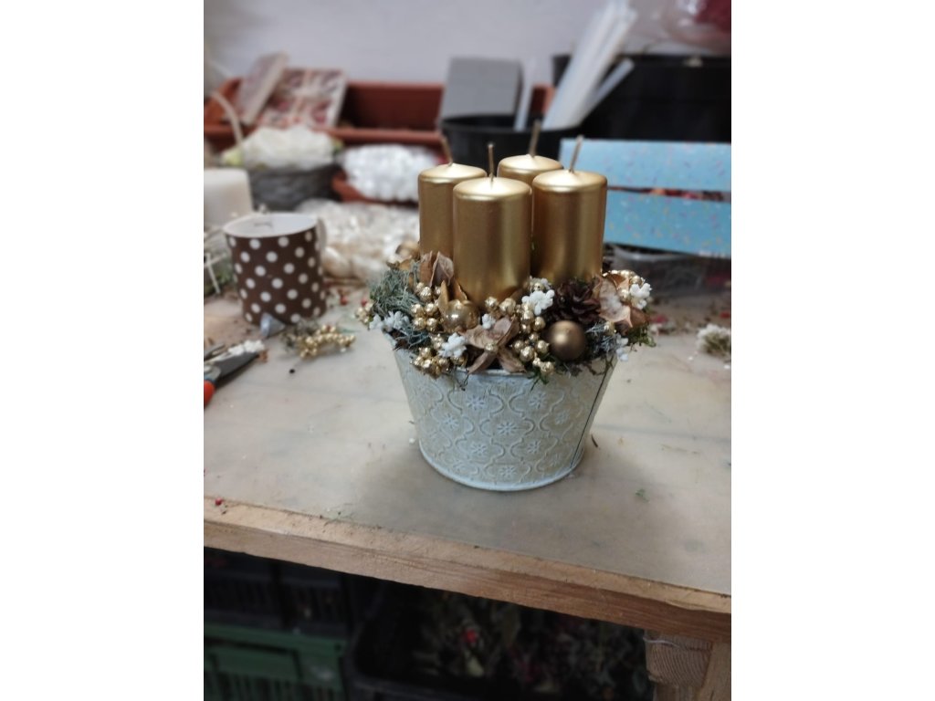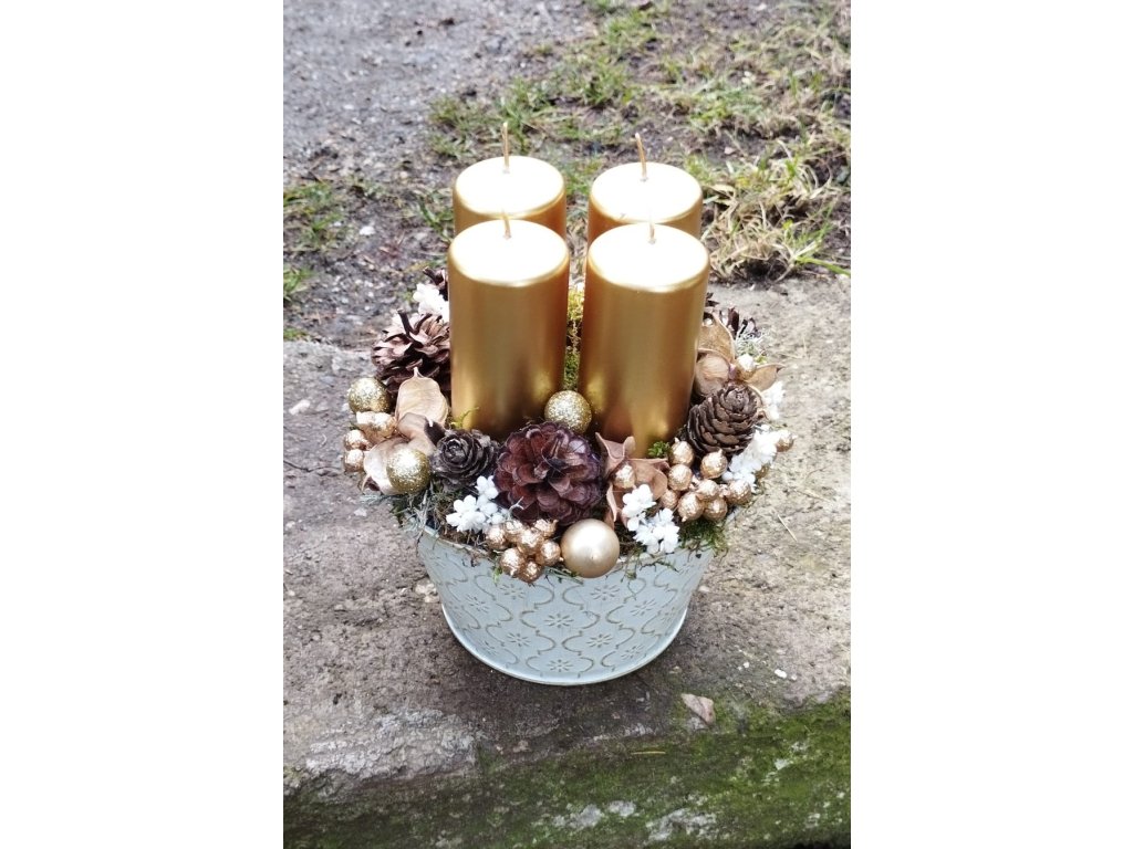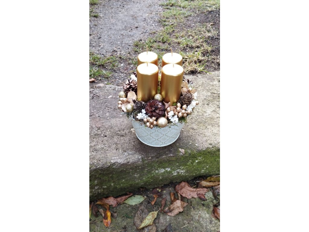 - Svícen v plechovém květináčku, laděný do zlato-smetanové. Rozměr cca 20x15cm.