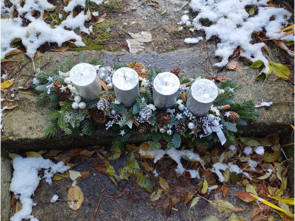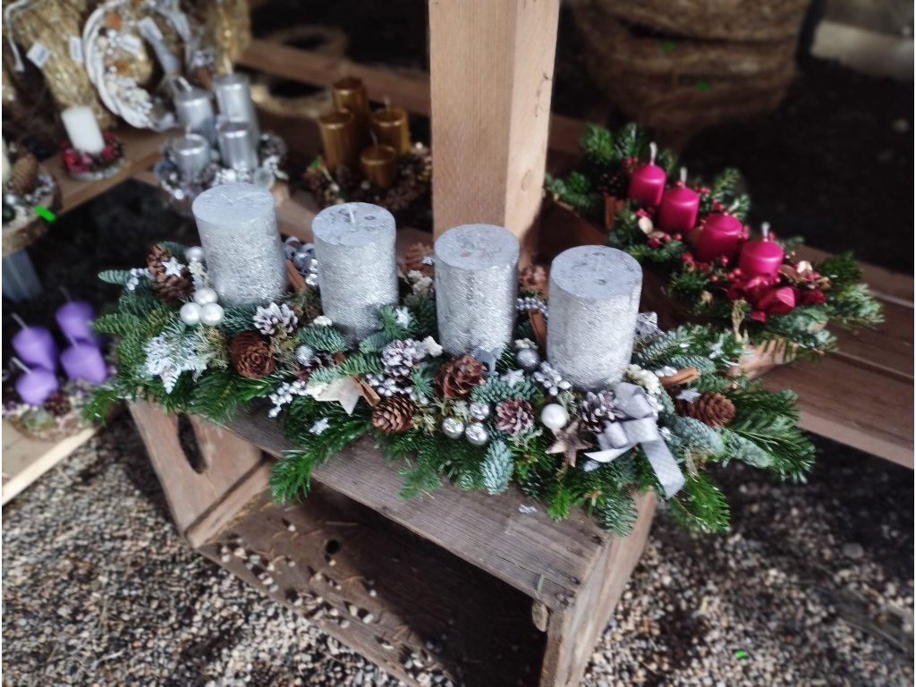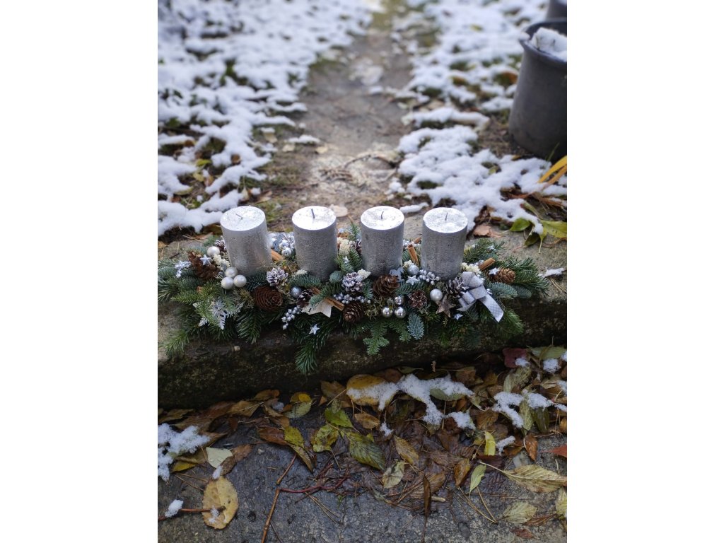 - Svícen na jedlové základu, vypichovaný florex. Rozměr cca 50 x 15 cm. Je možná i jiná barevná kombinace, dle dostupnosti barev rustikálních svíček.