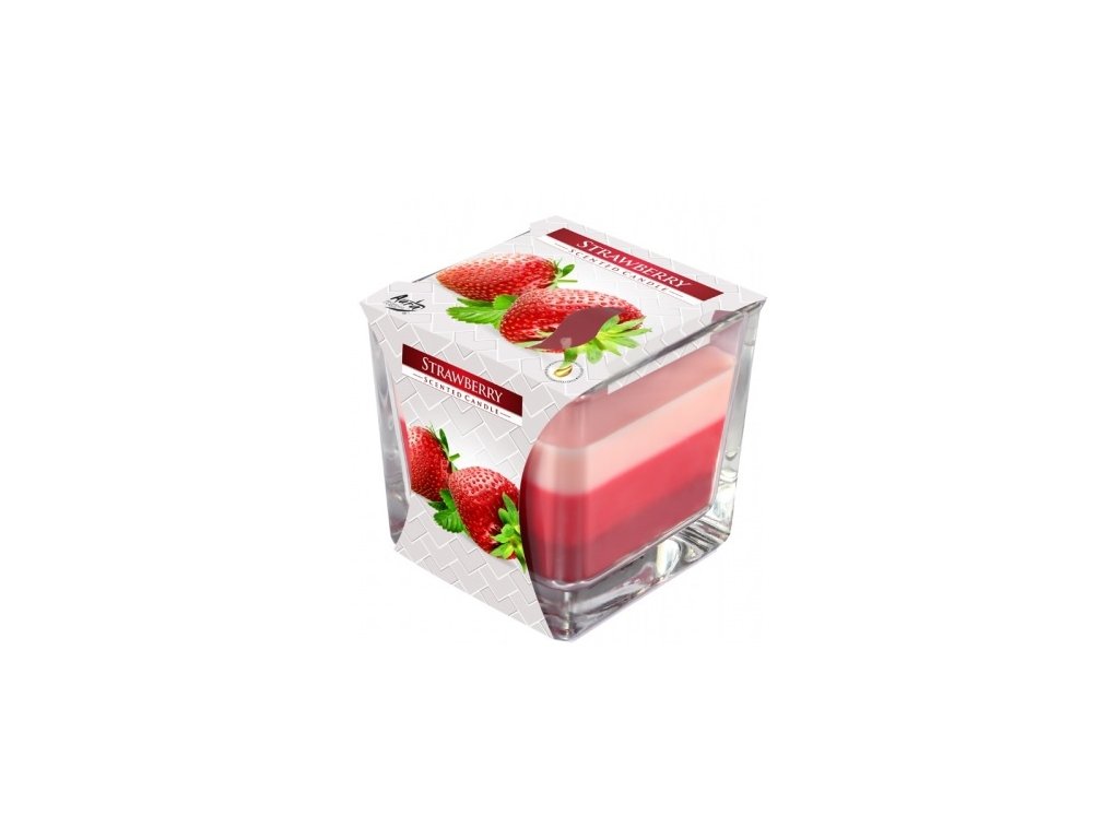 Svíčka v hranaté silnostěnné skleničce se 3 odstíny barvy s vůní jahody.