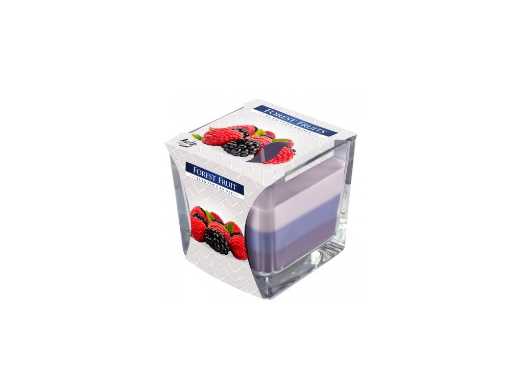 Svíčka v hranaté silnostěnné skleničce se 3 odstíny barvy s vůní lesního ovoce.
