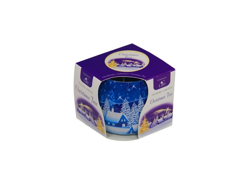 Parafínová vonná svíčka v kulaté skleničce s potiskem s motivem vánočního stromu a zasněžené vesničky, zabalená v papírové krabičce se stejným motivem. Hmotnost: 100g. Velikost: 8 x 8 x 7,5 cm.