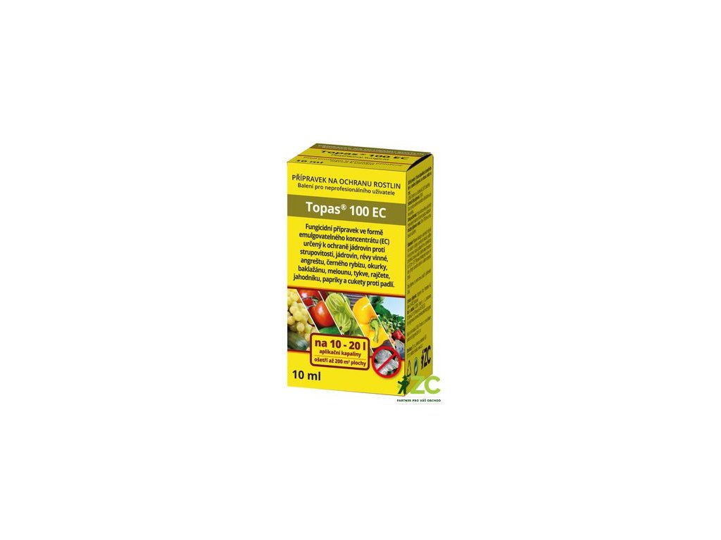 Topas 100 EC je systémově účinkující fungicid s výrazně vynikajícím účinkem proti pravému padlí v různých kulturách. Účinná látka proniká do rostliny prostřednictvím listů a stonků a nemůže dojít ke smytí deštěm. Topas 100 EC můžeme používat od začátku vegetace a dále pak v průběhu celé sezóny. Ošetřuje se preventivně ( padlí jabloňové a révové ).