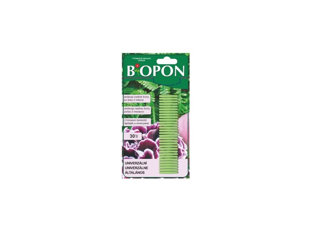 Univerzální hnojivové tyčinky Biopon dodávají rostlině živiny po dobu 2 měsíců, jsou plně rozpustné. Každá tyčinka systematicky dodává rostlinám živiny. Dusík obsažený v hnojivu je základní složkou rostlin, fosfor má vliv na pravidelný růst a draslík zodpovídá za procesy kvetení.