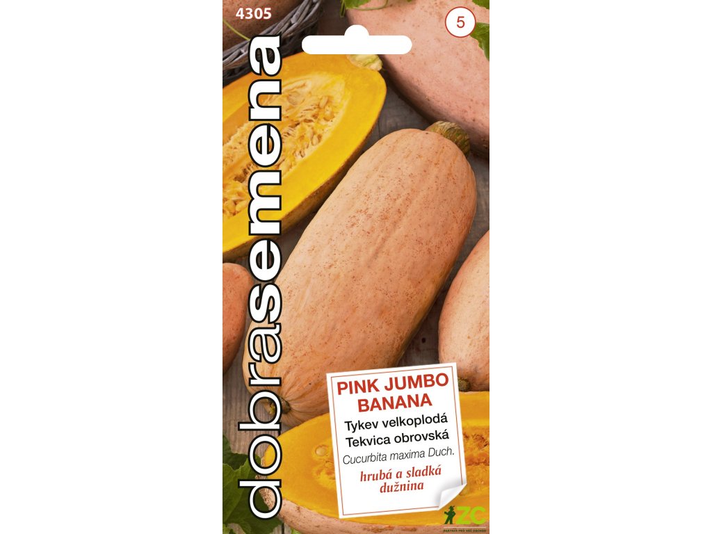 PINK JUMBO BANANA ¦ plazivá tykev ceněná pro vysokou jakost dužniny a dobrou skladovatelnost. Plod je větší, protáhle oválný, se středně tvrdou, růžově zbarvenou slupkou. Dužnina je hrubá, pevnější konzistence, velice chutná. Je výborná na pečení, polévky i na jiné typy zpracování.