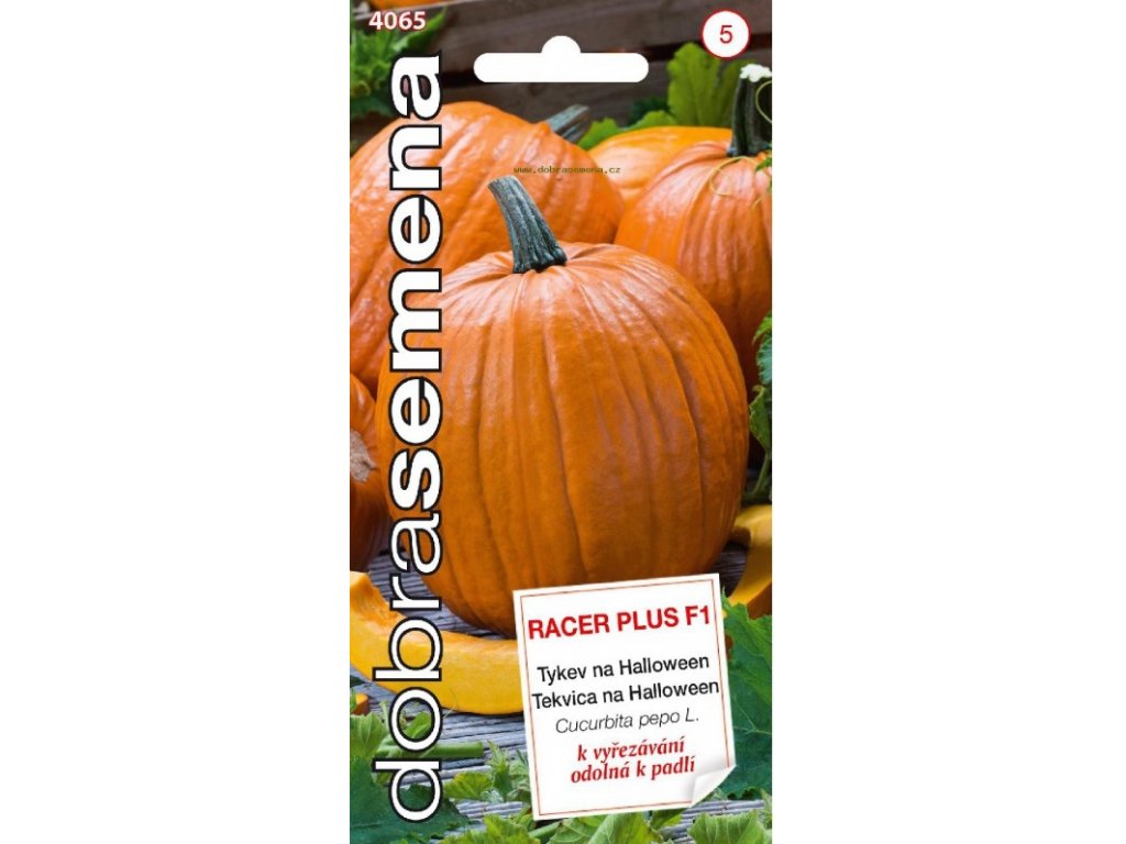 RACER PLUS F1 PMT - atraktivní oranžové plody o hmotnosti 5 - 7 kg vhodné na vyřezávání pro Halloween. Plody jsou pravidelně kulovité, mírně žebernaté, se sytě oranžovou slupkou. Plazivá tykev vyniká odolností k padlí (PMT = Powdery Mildew tolerant). Dužnina je vhodná na kompoty i polévky. Vyžaduje slunné stanoviště a úrodnou půdu s dostatkem živin.