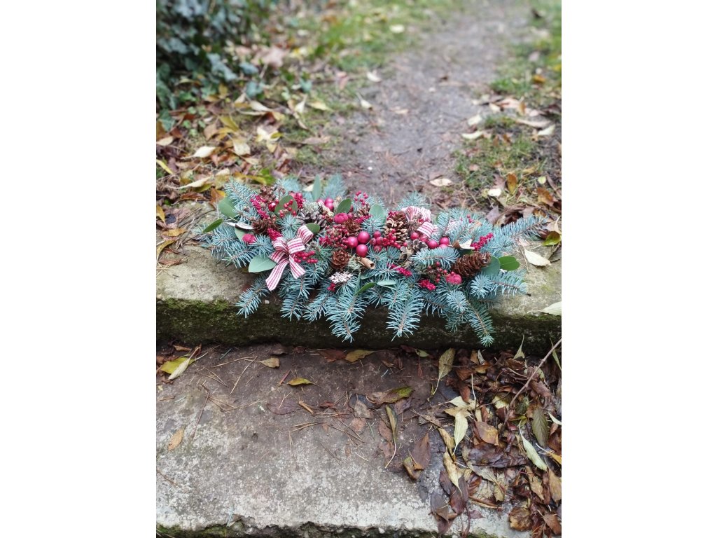 - Vypichovaná dekorace ve florexové misce, laděná do červena cca 60x20cm rozměr.